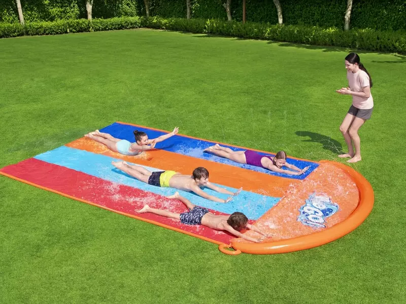 Hvem suser hurtigst ned ad vandrutsjebanen? Den lange vandglidebane fra Bestway giver dig dit eget vandland i haven og inviterer til race mellem fire personer på samme tid. Tæl ned fra tre, sus af sted og se, hvem der lander hurtigst i poolen for enden af