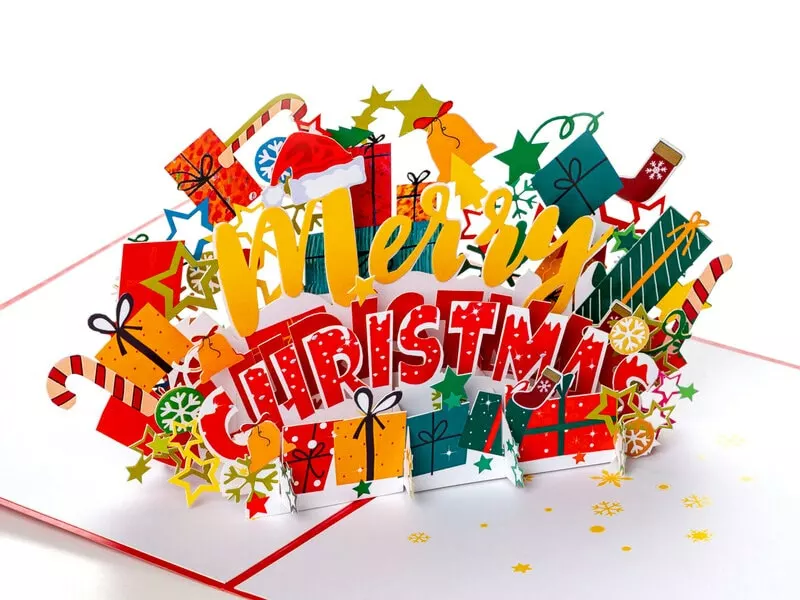 Ønsk en rigtig glædelig jul med et julekort ud over det sædvanlige! Når dette farverige og anderledes 3D-julekort åbnes, dukker teksten Merry Christmas op med en julet hilsen til modtageren! Leveres med kuvert.